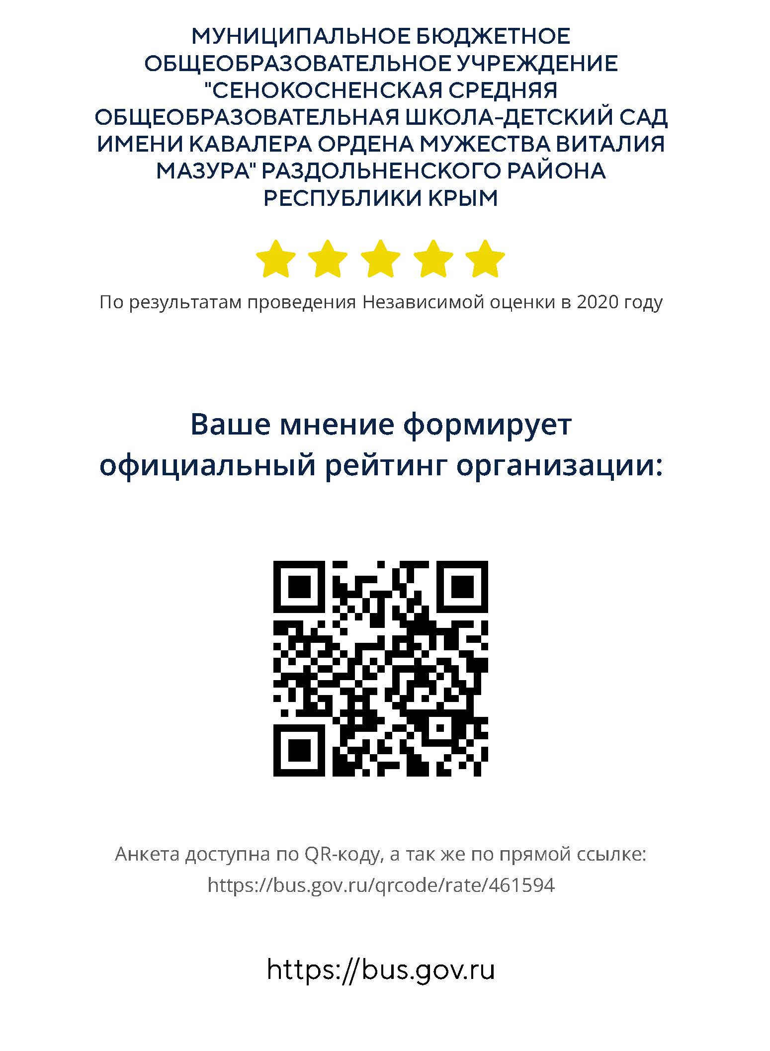 МУНИЦИПАЛЬНОЕ БЮДЖЕТНОЕ ОБЩЕОБРАЗОВАТЕЛЬНОЕ УЧРЕЖДЕНИЕ "СЕНОКОСНЕНСКАЯ СРЕДНЯЯ ОБЩЕОБРАЗОВАТЕЛЬНАЯ ШКОЛА-ДЕТСКИЙ САД ИМЕНИ КАВАЛЕРА ОРДЕНА МУЖЕСТВА ВИТАЛИЯ МАЗУРА" РАЗДОЛЬНЕНСКОГО РАЙОНА РЕСПУБЛИКИ КРЫМ